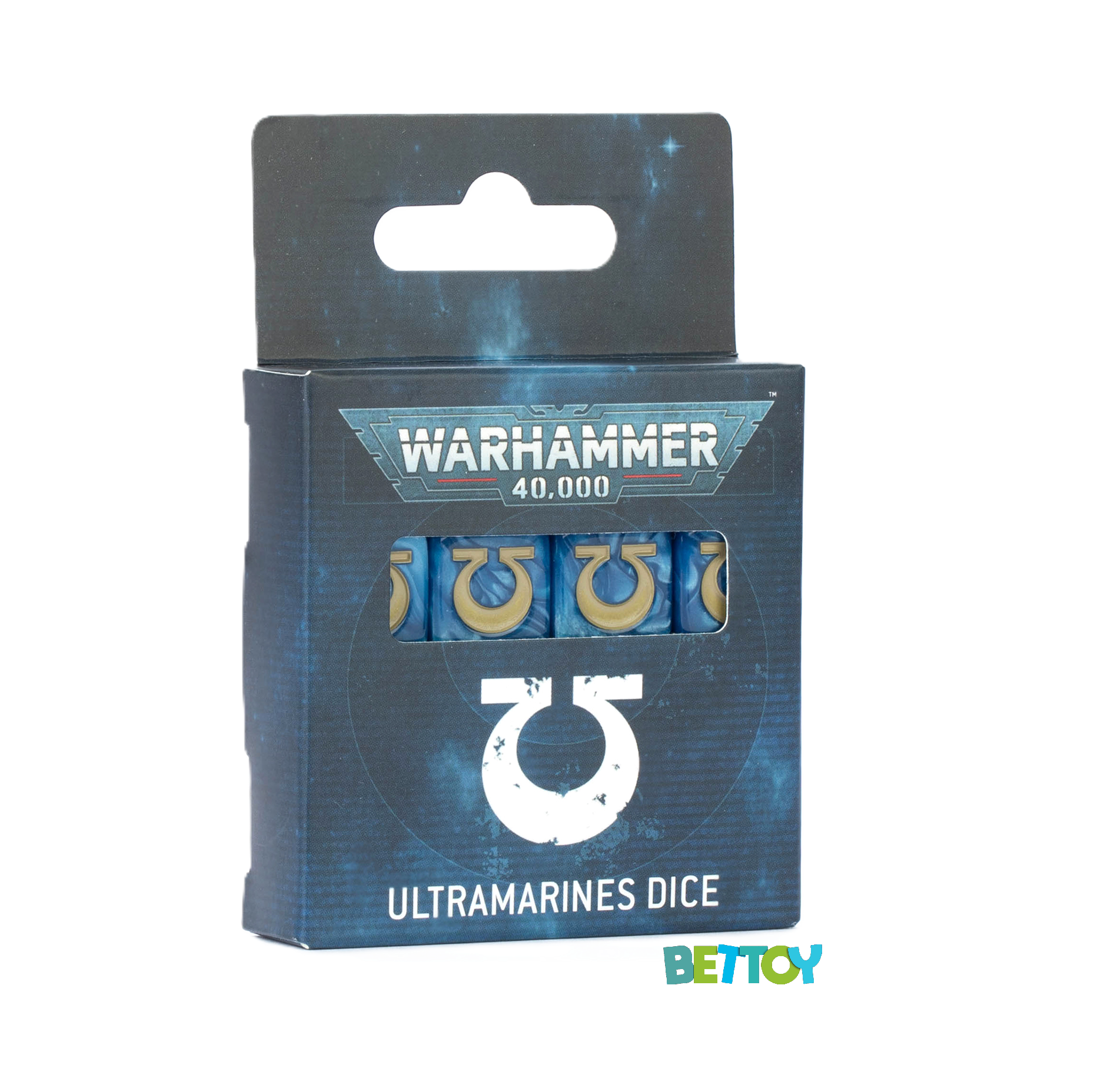 Un juego de 16 dados de seis caras con esquinas cuadradas para usar en partidas de Warhammer 40,000, con la temática de los Ultramarines. Están fabricados en plástico acrílico de color azul perlado con muescas en tinta dorada y miden 16 mm de arista. Las caras del 1 al 5 presentan los tradicionales puntos y la cara del 6 está adornada con el orgulloso icono de los Ultramarines. Este juego de dados solo estará disponible hasta agotar existencias.